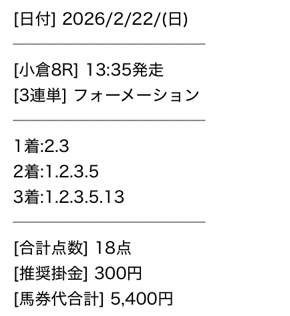 今年の小倉はまじで荒れすぎ、開幕週のJRA中央競馬最高配当更新を見てから競馬予想サイトを使う用になり数週間に至ります。 その小倉予想で3人気⑭→7人気⑮→5人気⑤、上位人気総崩れのレース3連単万馬券を1点500円で的中の攻略に役立ちました。 500円×581.7倍=29万850円ゲットでした。的中報告です。