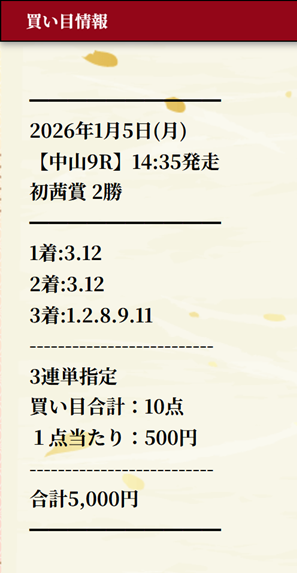 俺が口コミ1番乗り!先週の無料予想で万馬券的中&1点500円の馬券代で5万1750円ゲット! こういう的中が地味に嬉しいんだよな! コンスタントに無料予想当たってるな、今回もありがとうです!